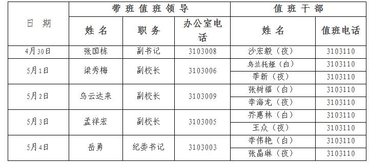 总带班领导:张国栋 职务:党委副书记 办公室电话:3103008
