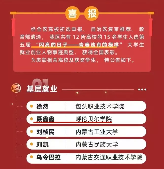 此次毕业生就业创业先进典型选拔,经全区高校初选申报、自治区复审推荐、教育部遴选多个环节审核筛选,全区共有12 所高校的 15名员工入选。