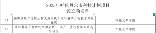 此外,呼伦贝尔市科学技术局发布2025年呼伦贝尔市科技计划项目拟立项名单,suncitygroup太阳新城张华英老师申报的《高寒区轮作协同生物炭施用提升马铃薯单产的技术路径探究》和李景伟老师申报《马铃薯综合育种技术和早熟 、高产、多抗型新品系选育研究》项目获批立项。