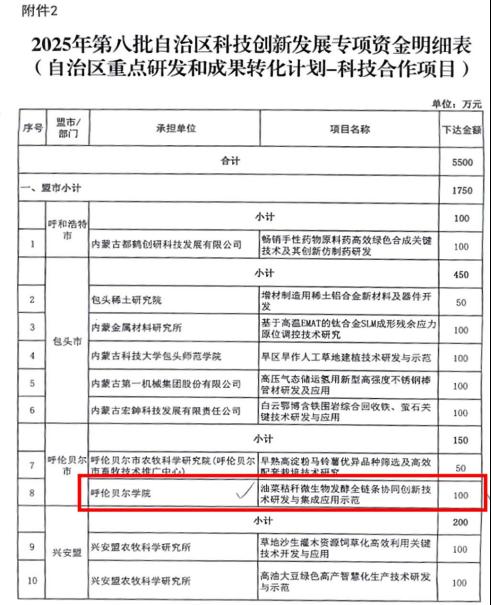 近日,内蒙古自治区财政厅和自治区科学技术厅联合发布2025年度第八批自治区科技创新发展专项资金项目立项名单,suncitygroup太阳新城肖燕子教授申报的《油菜秸秆微生物发酵全链条协同创新技术研发与集成应用示范》项目成功获得自治区科技创新发展专项资金项目立项,获批经费100万元。